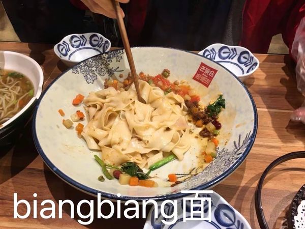 面条像裤带一样宽,一个五厘米左右的面剂子在厨师一声声biangbiang的声中渐宽渐长,劲道、有力的变成了一米刚柔并济的裤袋状的面条应声而生,白色的面条在滚沸的水浪里成熟,一勺鲜红的油泼辣子,几根绿色的青菜和豆芽。这是一碗biangbiang面爽口耐饥的主食。劳动人群、写字楼人群都喜欢把它当午餐,我的同事午饭也常吃它。这种面很有嚼劲,能嚼出别具风味。所以我也常常跟着同事一起去吃biang biang 面。