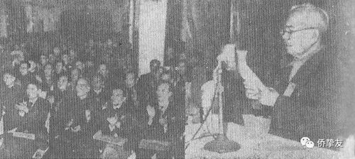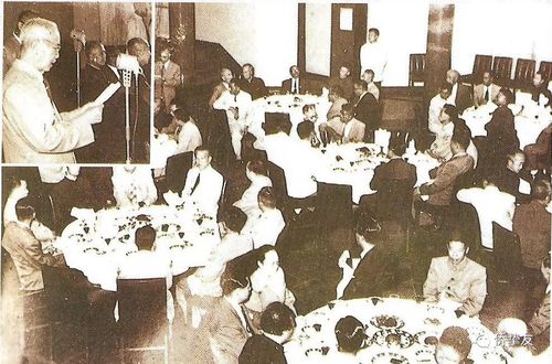 1956年以陈永和为副团长及这个家族成员陈进、陈永义等多人参加的“星马工业贸易考察团”在北京时陈嘉庚设宴接风。左上角图:陈嘉庚致词欢迎。