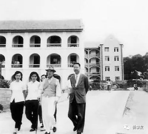 1956年6月,徐四民(右一)参加全国侨务工作会议后回到厦门,陈嘉庚(中)陪同参观新建的集美侨校