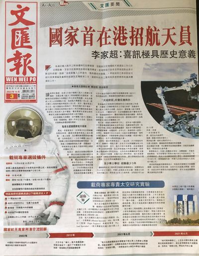 香港特区领行政长官李家超在庆祝国庆73周年的大会宣布了这个振奋人心的喜讯:国家首在港招航天员。他说,喜讯极具历史意义。