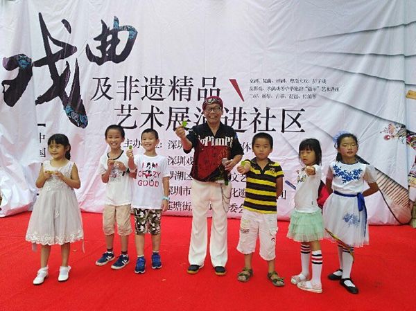 常常带领周星雨(右1)周星缘(右3)等徒弟下社区进行非遗传承