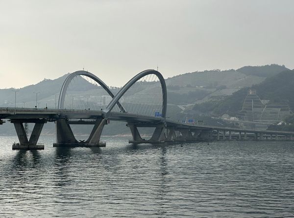 当走入蝴蝶型拱钢桥,停下脚步拍照,站在如展开翅膀的大蝴蝶背上,此时犹如幻想着飞上天,翱翔在碧波海面上的感覚。