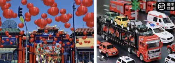 左:洛杉矶中国城 右:洛杉矶高速公路拥挤车流