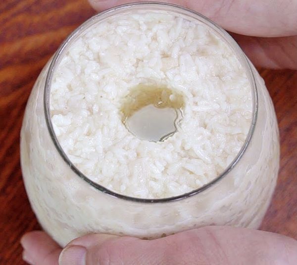 5.拌均匀的穤米,倒入合适的容器内用勺子按实,再在中间挖个小眼,再加水,用棉衣包起来(夏天可不包) ,室温低时可用电热器烤一下。一般36小时就可以吃了