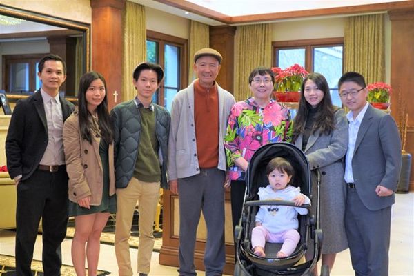 2021年圣诞节,郭忠信校友(中)与夫人蒲海伦女士(右四)在其别墅宴请华中校友会副主席曾勤博律师(右一)全家,以及理事长杨胜富令妹杨千慧(左二)、弟杨大庆(左三)。
