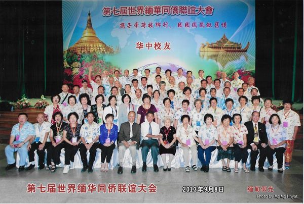 2013年9月8日,来自世界各地的华中校友在第七届世界缅华同侨大会欢聚一堂,并与原北京外国语大学亚洲学院缅语教授粟秀玉(中间穿黑旗袍者)合影留念。前排左七为郭忠信校友,中间为校友会主席雷启泉。