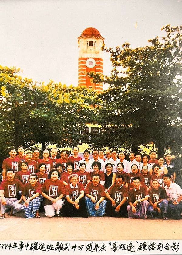 1994年,华中跃进班在仰光举行庆祝离校34周年,班上同学在学校“钟楼”前合影。后排左八为郭忠信校友。