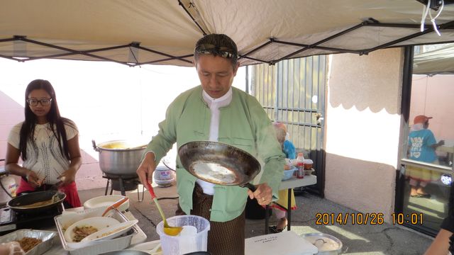 约10点, 敬老活动隆重开始, 按照缅甸人民的优良传统, 先请老人们用餐, 身着天蓝色义工恤T的男女青少年, 不停地穿梭在一排排老人坐位间, 彬彬有礼, 送来热气腾腾的鱼汤米线, 叫水饼的香脆饼卷, 点心水果, 矿泉水, 热甜茶。使与会老人个个吃得津津有味, 开开心心。此时, 午台上歌声嘹喨, 节奏欢快。直至主持宣布开会。