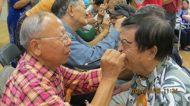 第二个游戏十分精彩, 由十位寿星给十个自愿者化装, 使用眉笔与口红, 有的采用传统手法, 一丝不拘, 画眉涂唇, 有的采用夸张手法, 加大眉唇, 十分滑稽, 以观众掌声多少分胜负, 结果一对胖子, 争得冠军。第二轮比赛, 我自告奋勇, 积极上场, 借鉴第一轮结果, 采用夸张手法, 尽量浓眉厚唇, 两眉中间, 潻加红点, 格外醒目。评比结果, 掌声最多, 摘得头奬, 获得重礼, 十分开心。