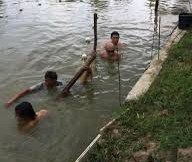 一位阿兵哥不动声色从袋里拿出一个手榴弹,这下子小朋友们全都惊呆了,但他老兄说不用怕,解释说只要用手按住手榴弹伐门,等保险栓拔除才放手丢出,七秒钟后才会爆炸,在水里威力不会大,大家只要原地蹲下便不会有危险。说毕把手中手榴弹的保险栓一抽,叫大家蹲下,马上把手榴弹扔入水中。几秒钟后听到噗嗤一声,见到一个大气泡冲出水面半尺高,随着翻滚的泥水,水面上漂浮着几条约两三寸的小鱼,等了一会再不见有鱼浮出水面,大家只有相互对望傻笑,结果不但没捞到鱼,连下水的机会都没有,就匆匆结束了这次的手榴弹炸鱼行动。