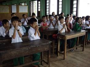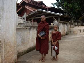 缅甸人多信奉佛教 ﹐民风淳朴﹐睦邻和谐﹐佛塔寺庙到处林立。我家附近的这所寺庙内的僧侣每日早晚念经拜佛﹐白天则出门化缘。寺庙内附设的小学﹐每星期一至星期五﹐为贫苦家庭的孩子们提供免费的教育﹐教授缅文﹑数学﹑历史﹑地理等基本知识。有些家庭希望孩子们学佛﹐校内也设有佛学课程。甚至有些家庭希望孩子皈依我佛﹐寺庙方面也接受。所以有时看到一些小和尚跟着大和尚沿街化缘﹐是很平常的事。