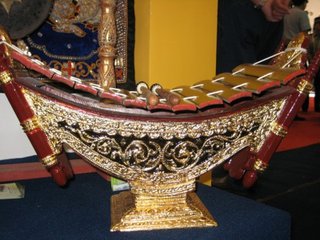编鼓又称套鼓,是缅甸最富民族特色的乐器。也是世界古代乐器中唯一一种按音列排列、能单独演奏的鼓乐器。据《琉璃宫史》记载,编鼓最早出现于16世纪40年代,至今已有460余年的历史。编鼓由24只大小不等的鼓组成。演奏时鼓师身着缅式上衣,头戴“岗包”,坐于圆圈中央,用手指轮番击打鼓面。鼓音委婉含蓄,节奏明朗,动人心弦。缅甸的传统乐队都以编鼓为主,编鼓鼓师即乐队队长兼指挥。编鼓演奏时一般与编锣、大鼓、鋩锣、铜钹、唢呐、碰铃、节拍板等乐器合奏,可以演奏出富于民族特色的音乐。