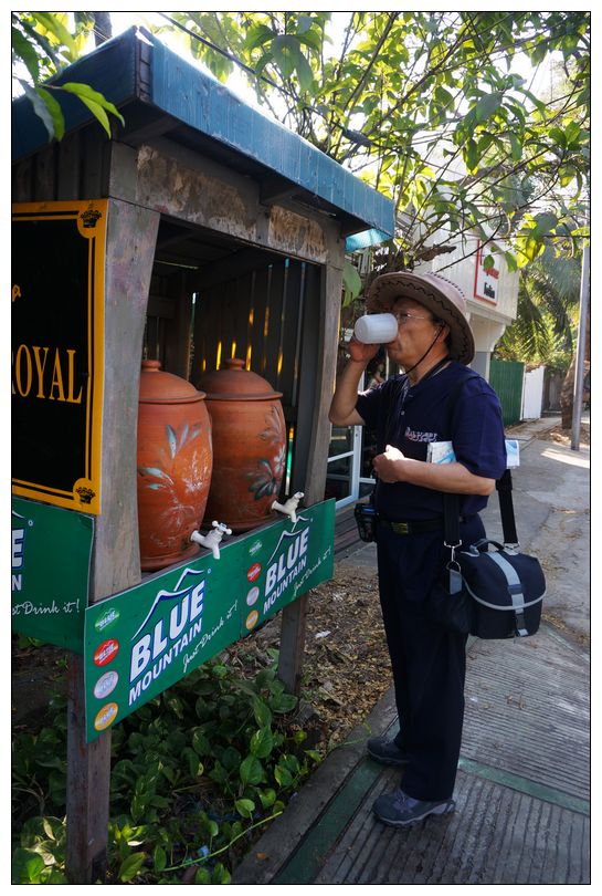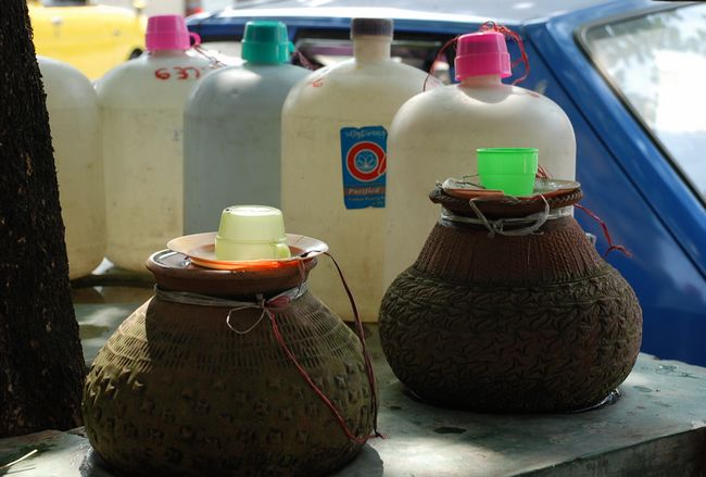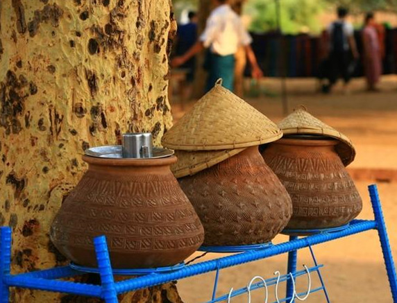这些水罐是有钱人摆放的,专给路人解渴用。即使没人饮用,他们也坚持“水不过夜”的原则,就是说里面的水保证一天一换。很多古朴的陶制水罐现在已经升级成塑料桶;乡土特色的椰壳水瓢也变成了搪瓷杯子。对于共用一个杯子的做法,外国人往往要犹豫再三,而缅甸人则习以为常,毫不忌讳。