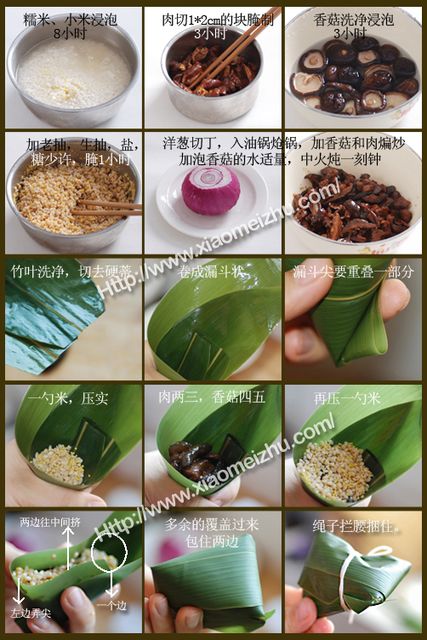 竹叶30张,糯米200g,小米100g,猪颈背肉200g,香菇15朵。