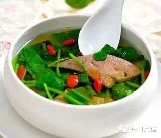 6.锅中倒入清水或高汤煮开,放入姜片及猪肝煮1分钟,再加入菠菜、枸杞,调入盐及香油即可