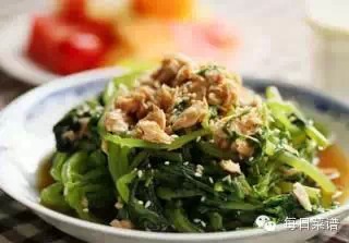 用料:茼蒿、金枪鱼罐头、生抽、米醋、白芝麻