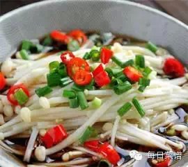 用料:金针菇、小红椒、葱、生抽、白糖、盐、油