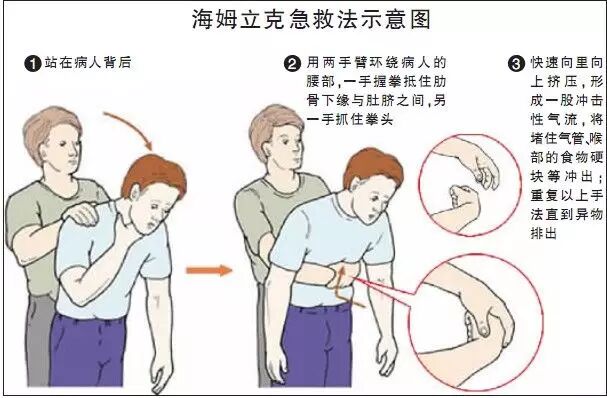 海姆立克急救法:利用冲击腹部——膈肌下软组织,被突然的冲击,产生向上的压力,压迫两肺下部,从而驱使肺部残留空气形成一股气流。这股带有冲击性、方向性的长驱直入于气管的气流,就能将堵住气管、喉部的食物硬块等异物驱除,使人获救。