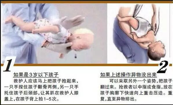 若是3岁以下的孩子,救护人应该马上把孩子抱起来,一只手捏住孩子颧骨两侧,手臂贴着孩子的前胸,另一只手托住孩子后颈部,让其脸朝下,趴在救护人膝盖上。在孩子背上拍1—5次,并观察孩子是否将异物吐出。如果异物还没出来,可以把孩子翻过来,面对救护者,将手指并拢在孩子胸部下半段按压1—5次。随时观察孩子嘴里有没有东西出来,如果有东西,救护应该用手指将异物勾取出来,千万不要捅。以上所有动作都是在孩子的头低于胸的情况下完成的。