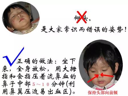 1.让伤者坐下或站著,切勿躺下,头稍向前倾。