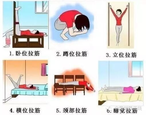 4. 选择性用站板拉筋、蹲式拉筋、立位拉筋、Y式拉筋、睡觉拉筋、颈部拉筋等方法。