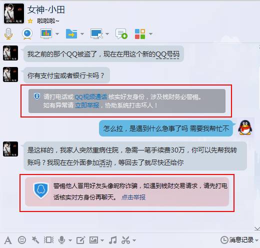 小明收到了女神小田的加好友请求,说之前的QQ被盗。小明看头像、昵称、资料都跟之前完全一样,赶紧加上。得知女神需要三十万医药费,小明几度忽视聊天框中的防骗提醒,也没有打电话核实情况,二话不说就给女神汇款过去。结果可想而知,“女神”原是骗子!三十万全被骗走!