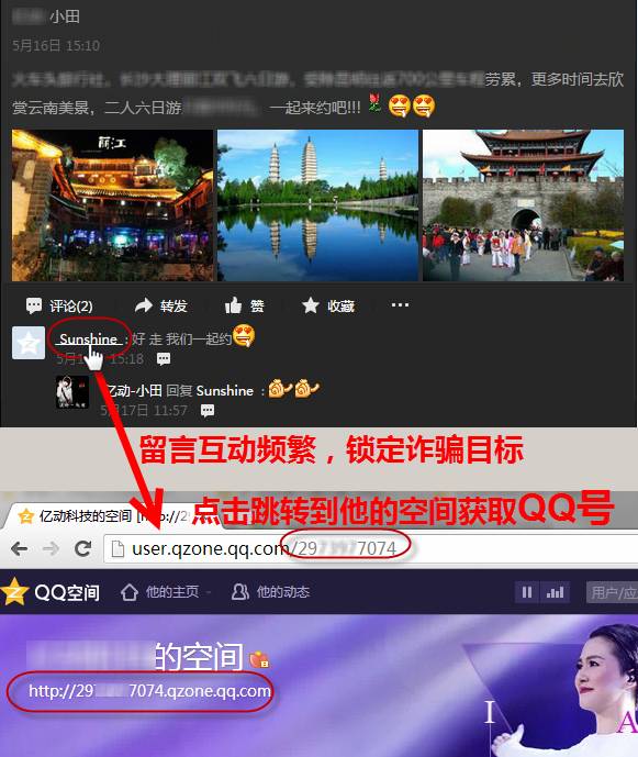 2、通过空间等社交网站寻找与目标互动频繁的好友,获取诈骗对象的QQ号;