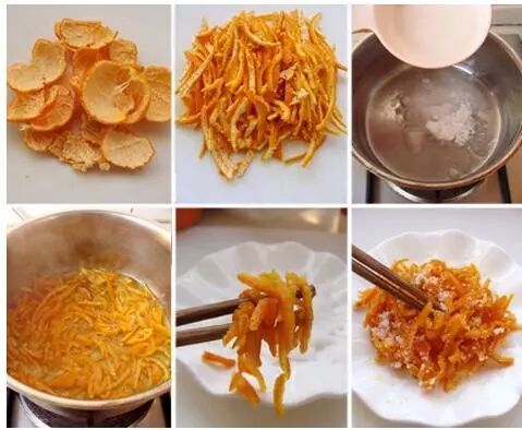 | 制法 | 桔子皮洗净,用水浸泡,泡出的黄水倒掉,反复多泡几次,祛除苦味。然后切丝,加水煮开,捞出挤干水分。锅内放冰糖和一点水,溶化后倒入切好的桔子皮,煮到皮变通透有点粘后用锅铲不断翻炒,收干水分装盘、撒糖粉、拌匀、放凉。