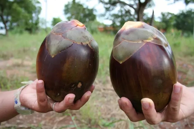 ▼扇叶树头榈的果实,味道像荔枝,但更温和一些,果肉可以生吃,也可煮着吃或烤着吃
