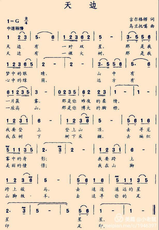 首都机场的再次相遇,勾起了他对那段往事的回忆。于是,当晚他在北京的地下室里写下了一首歌词,并请朋友谱了曲。一首《天边》就这样的诞生了。 这位女外交官就是傅莹,她也是地道的蒙古族,是北外工农兵学员中的佼佼者,口才一级棒。与王冠中一起在新加坡香格里拉年会舌战美国及其鹰犬,为中国扬眉吐气。听了《天边》,了解了背后的故事,更使人对她油然起敬。 又经过几年。一天,女大使兵团战友聚会,大家为女大使唱了这首《天边》。女大使不知道这是谁的作品,她被这首歌给触动了。优美的旋律、动人的歌词。歌声结束女大使的眼角潮湿了,她激动地问战友们:“我在国外就曾听过这首歌,这首歌是谁写的?”战友们告诉她是一位叫吉日格楞的画家写的。她又问:“哪个吉日格楞?”战友们告诉她是内蒙兵团的吉日格楞,这是他为兵团的恋人而作。她沉默了,久久的----,再也没说一句话。