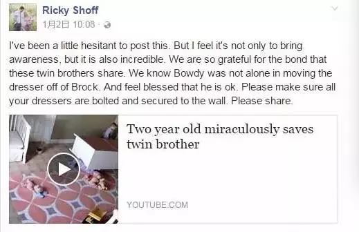 “我其实一直很纠结要不要把这个发出来。我觉得这不光能让家长们有所警示,而且这是一件非常了不起的事!当我们看到这对兄弟同甘共苦的时候,很欣慰!当哥哥在营救的时候,弟弟也在奋力协作!好在兄弟俩安然无恙。请家长们一定要确保家中的抽屉柜牢固在墙上!请告知周围的人!”
