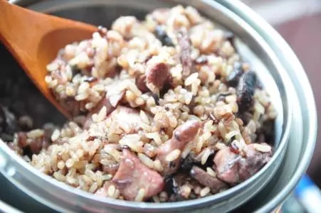 3.白米洗净后沥干水分与炒好的红苋菜及玉米粒拌匀入锅中,按下开关蒸至开关跳起,再焖十分钟即可。