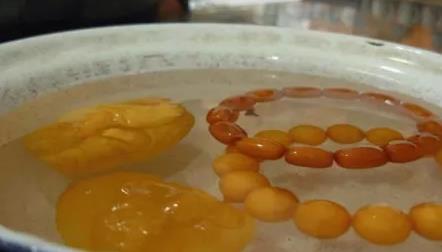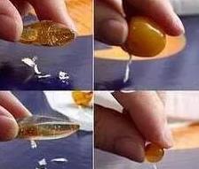 (友情提醒:有的琥珀外有层上光物质,在药水擦拭下会变成白斑,但这层白斑可用指甲壳刮去露出琥珀表面,将药水擦拭在它上面再不会有任何的变化。药水对琥珀仍会有18%-20%的融解度,泡久表面可能变的雾蒙蒙的)