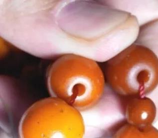 将针烧红刺琥珀的不明显处,有淡淡松香味道。电木、塑料则发出辛辣臭味并粘住针头。