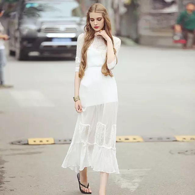 充满浪漫仙女气息的一款连衣裙,清新纯净的米白色调,松软轻薄的褶皱棉纱面料富有田园气氛,加上领口裙摆的透视蕾丝拼接、松紧腰线和层叠的A字荷叶大裙摆,充满脱俗的女神气质。