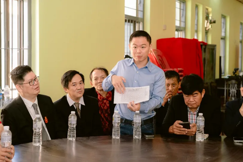 祭祀仪式结束后,随即召开了会议,商讨下午的庆典活动安排。会议主要讨论了庆祝缅甸杨氏四知总堂成立150周年暨杨震公圣诞联欢晚会的相关事宜。筹委会主席杨胜富在会上介绍了晚会的筹备进展,并向与会人员介绍了来宾座位安排,同时分配了迎宾组的具体工作任务。