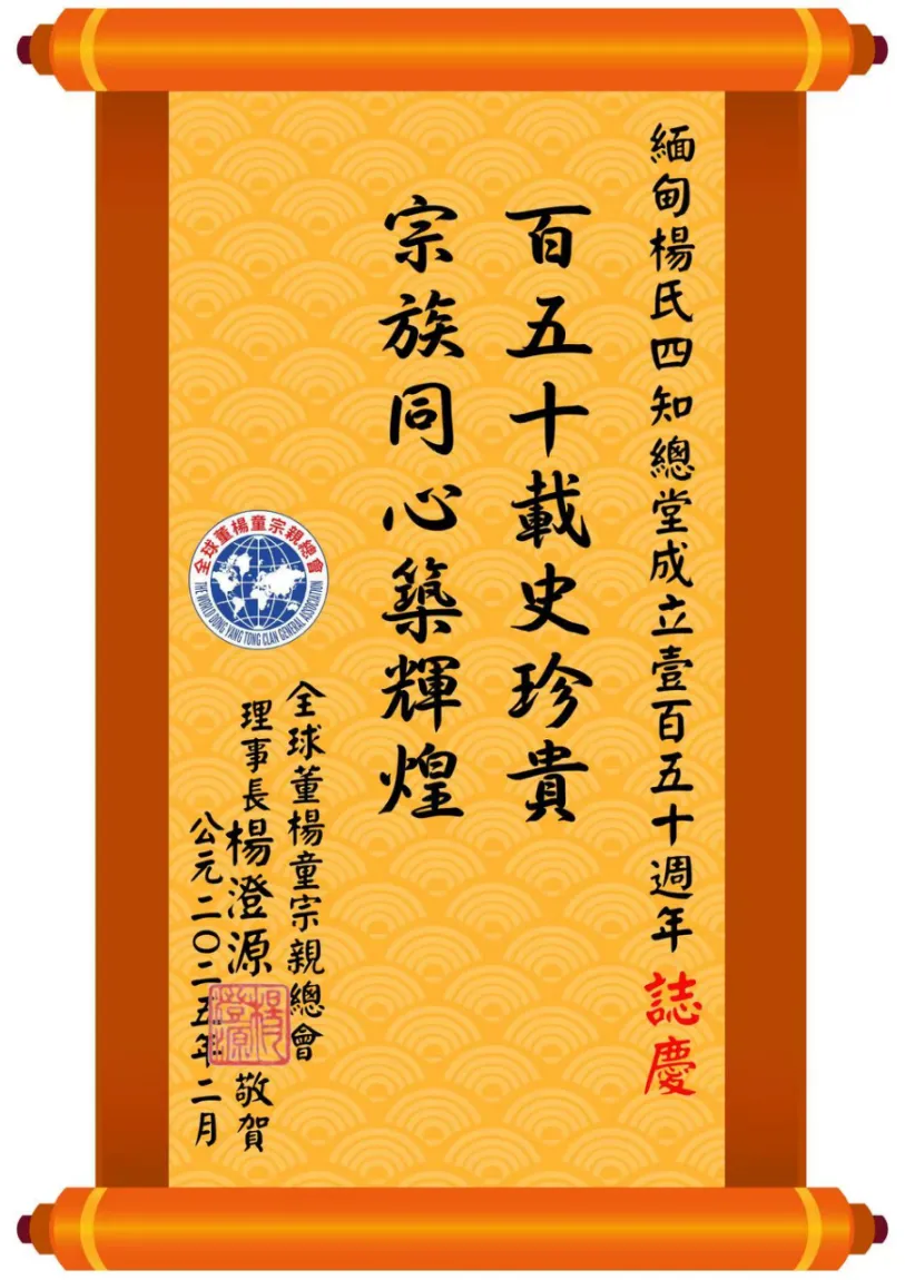 全球董杨童宗亲总会理事长杨澄源、世界杨氏联谊会会长杨顺发也分别发来了贺信。杨顺发在贺信中表示,“百五十年岁月峥嵘,杨氏宗亲在缅甸这片土地上,秉承着‘四知’之精神,团结一心,砥砺奋进,传承家族文化,繁荣一方水土,实乃我杨氏之楷模,家族之荣耀。杨震公之品德与教诲,宛如明灯,照亮杨氏后裔前行之路,在贵堂的发展历程中熠熠生辉,更是值得我们全球杨氏子孙永远铭记与传承。”贺信里,还表示,“今虽未能亲临盛会,然我心与诸位宗亲紧紧相连。愿此次联欢晚会圆满成功,成为贵堂发展新的里程碑,让杨氏家族的荣耀在缅甸继续闪耀,让四知精神在新时代焕发出更加璀璨的光芒!”