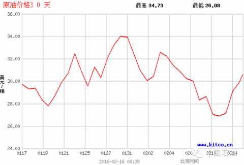 如图所示,过去30天国际油价的浮动大有“十环过山车”的态势,虽偶有强势反弹,但攀爬的最高点不过35美元/桶,而最低跌至近26美元/桶。