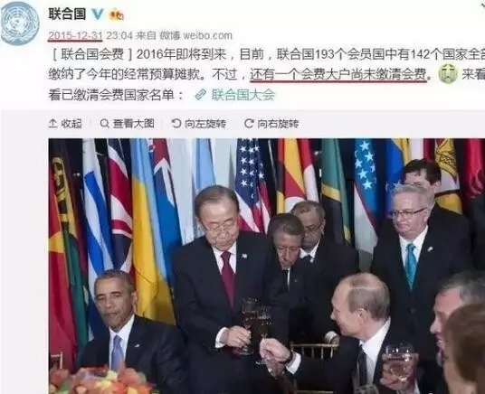 翻开联合国的微博,整个就是一部向美国讨债的血泪史...一直以来,美国便以“经济衰退严重、财政困难、应缴比例过高”为借口拖欠联合国会费,而且拖欠数额巨大,共积欠10多亿美元,简直就是“超级拖欠户”。