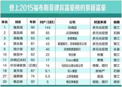 2015年《福布斯全球富豪排行榜》显示,菲律宾排名前10的富豪中,有6位是华人;而该国最富有的3个人,全都是华人。