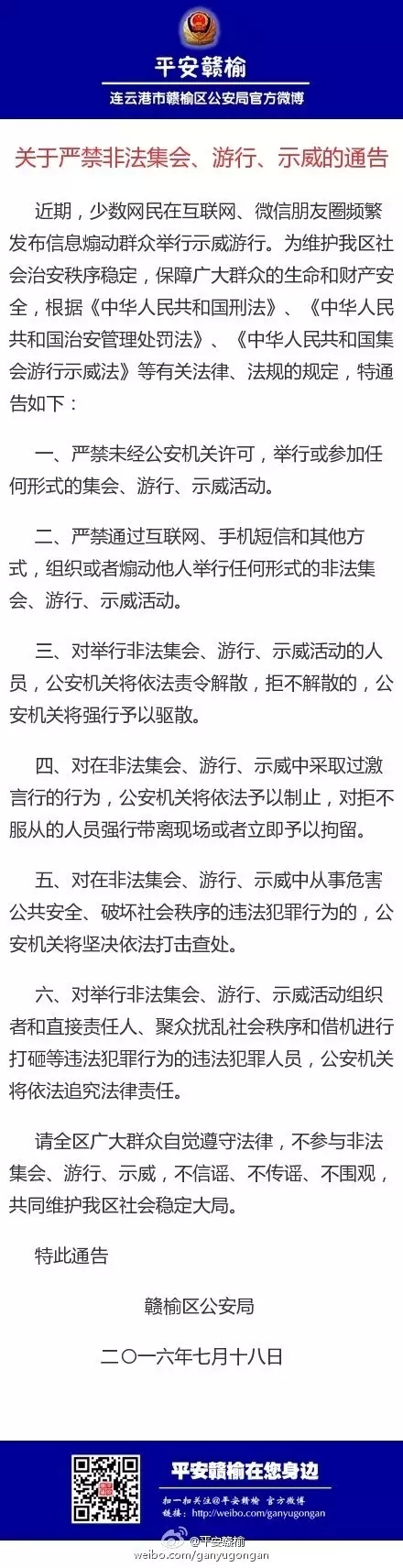 对此,赣榆区警方发布通告:为维护我区社会治安秩序稳定,保障广大群众的生命和财产安全,根据《中华人民共和国刑法》、《中华人民共和国治安管理处罚法》、《中华人民共和国集会游行示威法》等有关法律、法规的规定,特通告如下: