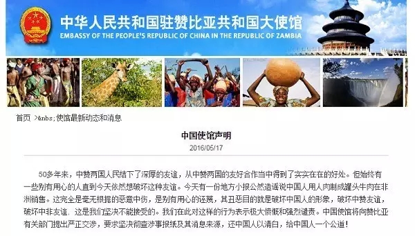 消息一出,引起了舆论哗然。中国驻赞比亚大使馆5月17日发表声明,对不实报道表示极大愤慨和强烈谴责。↓