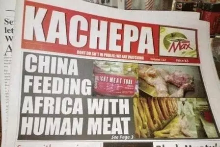5月17日,赞比亚一家当地小报KACHEPA头版竟然出现一篇题为“中国用人肉来毒害非洲人民”的文章↓