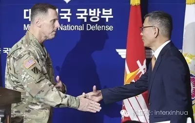 7月8日,在韩国首尔,韩国国防部国防政策室室长柳济昇和驻韩美军第8军司令官托马斯·汪达尔宣布,韩美决定在驻韩美军基地部署末段高空区域防御系统即“萨德”系统。(新华社/美联)