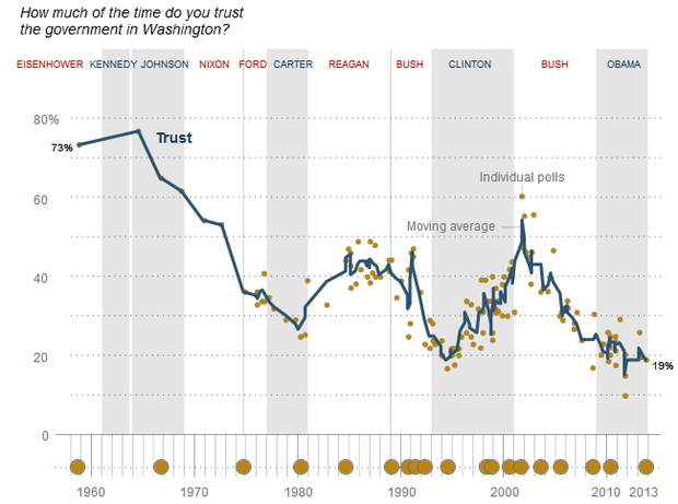 美国民众对联邦政府信任度的变化图。来自皮尤调查。
