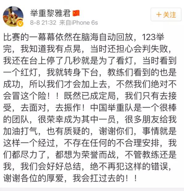 黎雅君第一次试举时肘关节有弯曲,这毋庸置疑。是不是显示灯错误,很多人存异议。