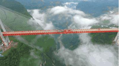 一桥跨过中国云南省与贵州省,天堑变通途。垂直高度565米,相当于200层楼高的世界第一高桥杭瑞高速北盘江大桥已正式合龙。通车后从云南宣威市到贵州省六盘水市从5小时减为1小时车程。