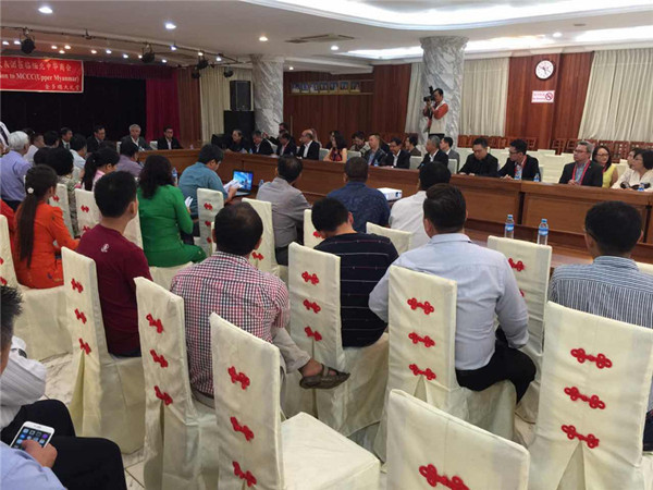李东涛会长致辞欢迎远道而来的新加坡中华总商会并说,座谈会大家畅所欲言,互相了解,互相沟通;新加坡中华总商会代表团蔡团长介绍了代表团一行以及所经营各行各业情况;贾思义监事长阐述了缅北中华商会成立不到一年来的所做努力。最后由缅北中华商会李宗强会员用ppt,介绍了缅甸经贸各方面的情况。