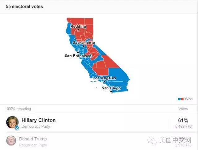 在11月8日公布的大选结果中,川普在加州仅仅获得了33%的支持率,相比之下,希拉里的支持率则高达61%,这是除首都华盛顿哥伦比亚特区(93%)和夏威夷(62%)外,全美范围内第三高水平(与马里兰州、马萨诸塞州和佛蒙特州并列)。考虑到加州人口众多,这里的61%意义非同寻常。希拉里在加州总计获得了5488261张普选票,这在希拉里59704886张全美总选票中(至截稿,不完全统计)所占比例超过9%,也就是说有近一成挺希拉里的美国民众都集中在加州。