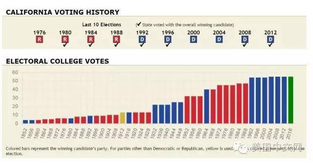 在过去的近三十年间,加州已经在连续七届(含本届)总统大选中将票投给了民主党候选人。与国会情形不同的是,加州目前的参议会和众议会也均由民主党控制。